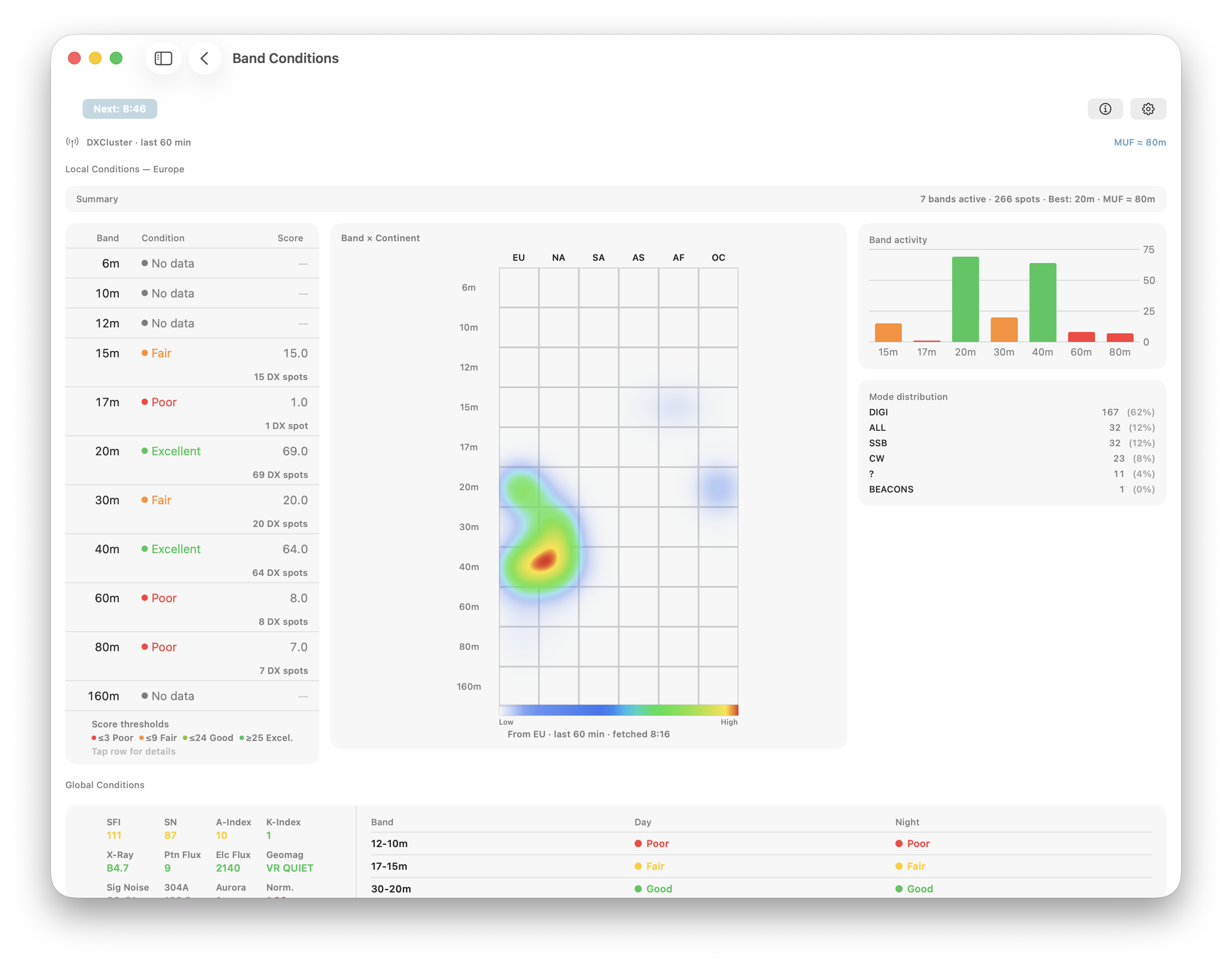 The Band Conditions tool provides real-time HF propagation information based on DXCluster spots. It helps you quickly assess which bands are currently active and how conditions compare across your home continent and globally.